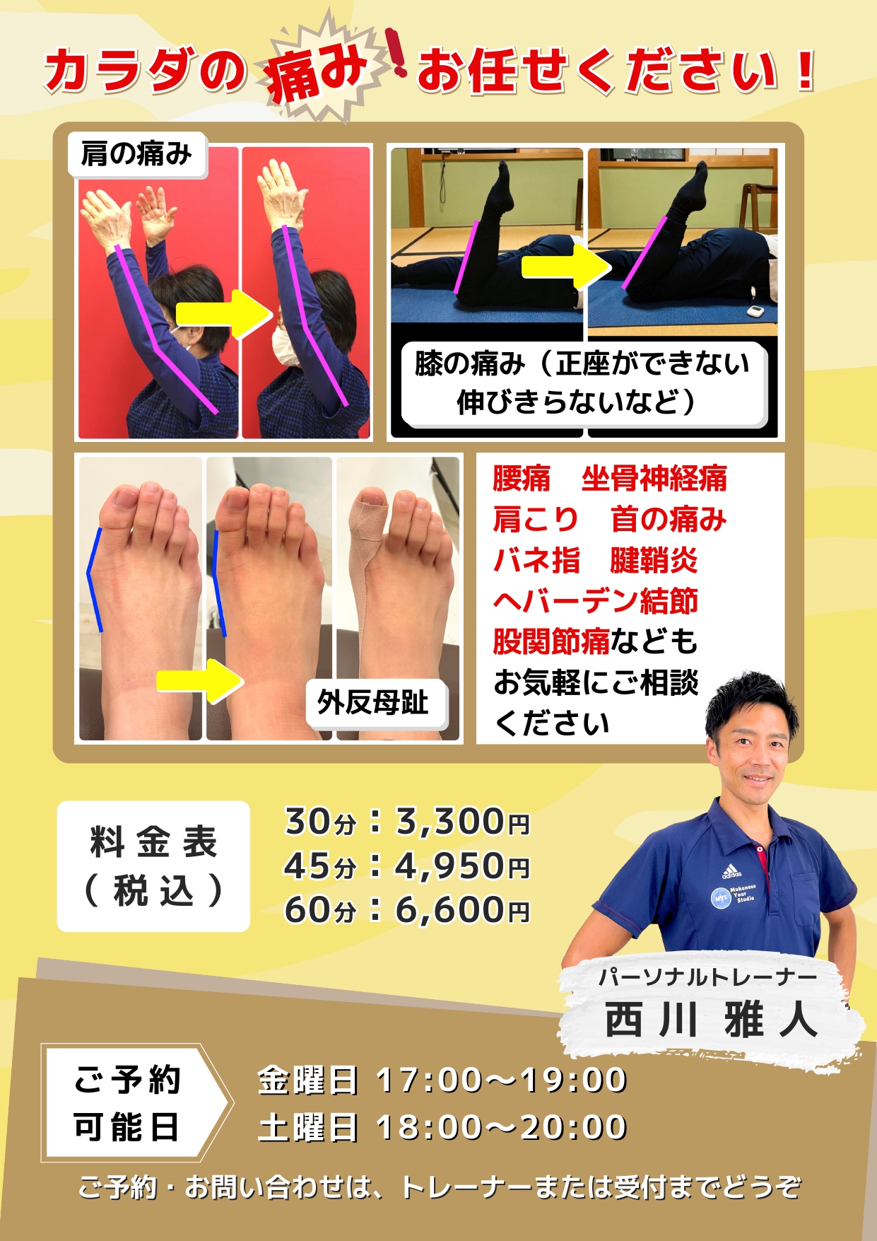 ご予約、お問い合わせは、トレーナーまたは2階フロントまで。